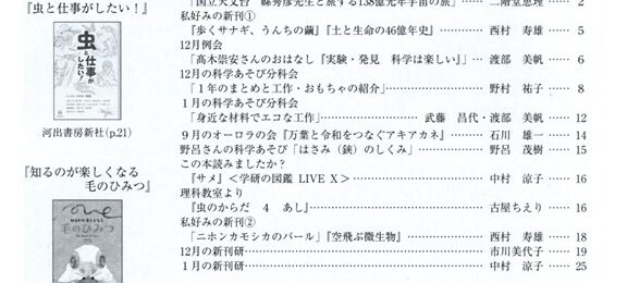 子どもと科学よみもの 2026 年 3月号 目次 12月特別例会「国立天文台 縣秀彦先生と旅する138億光年宇宙の旅」私好みの新刊①『歩くサナギ、うんちの繭』『土と生命の46億年史』12月例会「髙木崇安さんのおはなし『実験・発見 科学は楽しい』」12月の科学あそび分科会「1年…