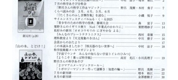 子どもと科学よみもの 2025 年 10月号 目次 7月例会「昆虫観察に行こう!オオムラサキも見られるかな?~オオムラサキ自然公園の自然~」7月の科学あそび分科会「野呂さんの科学工作&マジック」くらべ読みの会 3月、4月、5月、6月「『たくさんのふしぎ傑作集』を読む」サイエン…